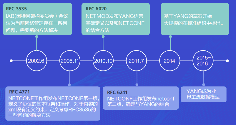 一句话总结:一帮网管大佬在IETF开了个会,分析了当时网络管理技术的优缺点(主要是吐槽缺点),然后发了个会议纪要,我们要搞个新协议,搞个新的数据建 模语言,让网管能管理配置下发,能监控设备,能各种远程操作,还要能跟CLI行为一致。