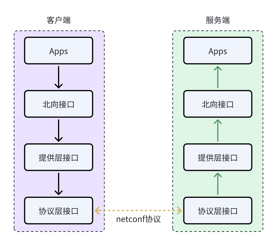 NETCONF协议也采用了分层结构。每层分别对协议的某一方面进行包装,并向上层提供相关服务。分层结构使每层只关注协议的一个方面,实现起来更简单,同时使各层之间的依赖、内部实现的变更对其他层的影响降到最低。