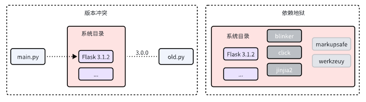 如图所示,当我们有两个项目都在依赖Flask且版本不一致时,此时发生依赖冲突;而一个依赖可能又会有它自己的其他依赖包,导致更多的冲突,完全无法管理。 那么如何解决这个问题呢,那就是虚拟环境。