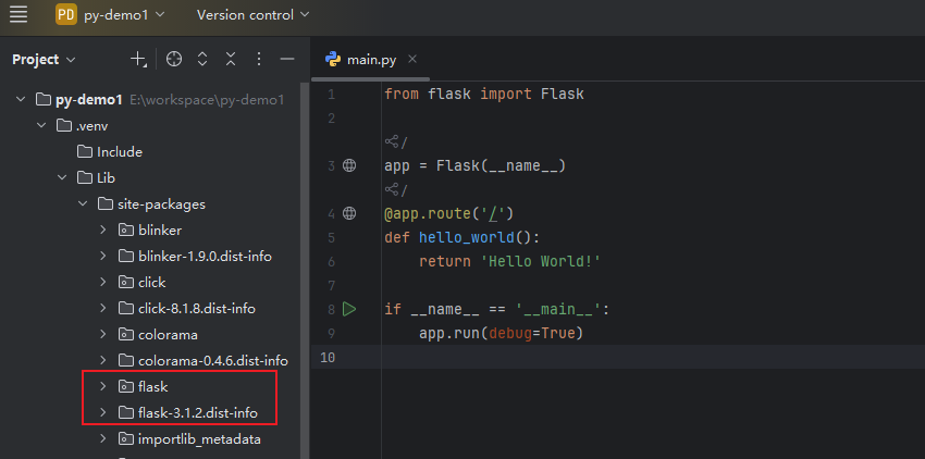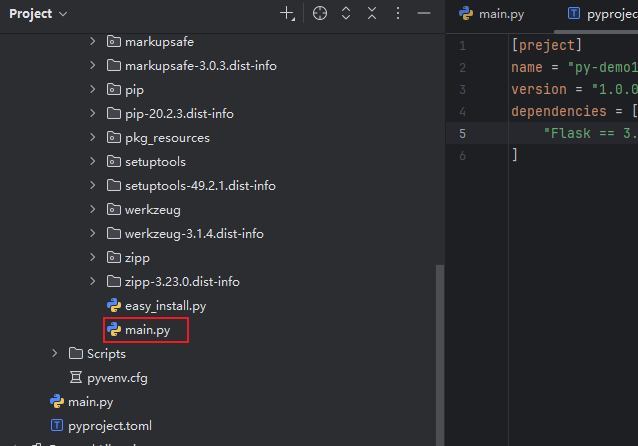 这样我们的项目中就存在两份相同的main.py文件,如果我们修改了源代码,这个代码并不会自动同步到虚拟环境中。所以我们需要在安装依赖时带上一个参数,