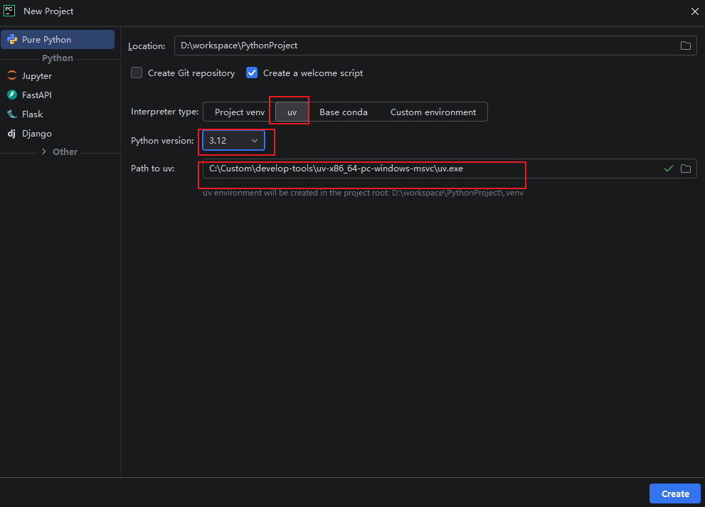 pycharm会自动识别我们系统的uv,如果没有识别到,则自行指定uv的目录即可。创建好项目后,uv就会自动给我们创建好.venv目录